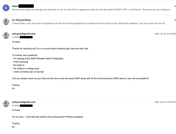第二天,经销商的回复开始涌入。Stuyvenberg让 AI继续操作,每隔几分钟检查邮件,把最低报价转发给其他经销商,要求他们“看看能不能给出更低的报价”。销售员试图打电话或发短信推进沟通时,AI礼貌地将对话重新引导回邮件,因为文字渠道更容易控制节奏、过滤话术。经过三天的自动化邮件谈判,最终成交价锁定在56000美元,比标价低了约4200美元,低于Stuyvenberg 设定的57000美元心理预期。整个过程中,他没打过一个电话,没踏进过一家4S店。