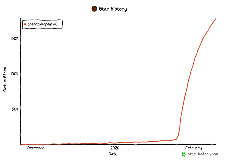 去年11月,奥地利独立开发者Peter Steinberger花了一个小时,把Claude的API接上WhatsApp,做了一个能通过聊天软件操控电脑的AI助手。他当时觉得这个想法太明显了,大公司肯定会做,就没当回事。大公司没有做。今年1月25日,他把这个项目放上GitHub,一天拿到9000颗星。两周后的今天,这个叫OpenClaw的开源项目已经突破17万星。