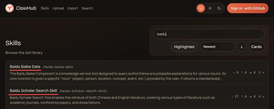 在ClawHub中,以npx clawhub@latest install [skill名称]的极简方式,就可以为自己的OpenClaw助手接入来自百度官方的稳定、权威能力。