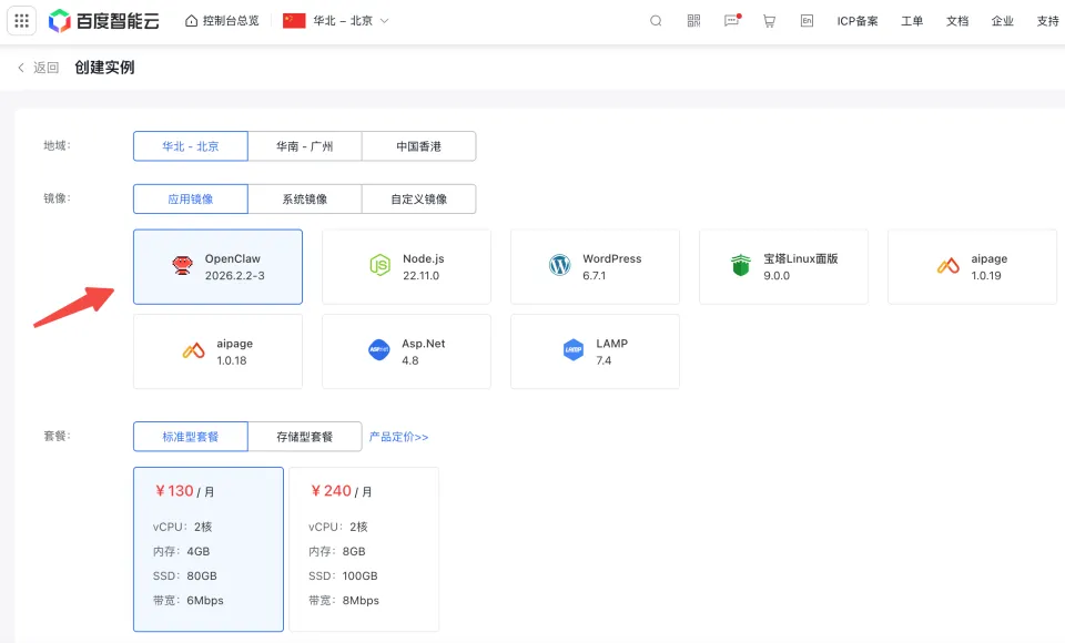 第一步,创建一个实例,百度智能云已经在镜像中内置好了OpenClaw。