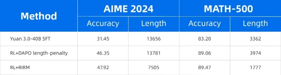 果然,Yuan 3.0Flash引入RIRM后,上面这座冰山被腰斩:反思阶段token占比骤降至28.4%,总token压缩至1777左右,减少约47%,而准确率不降反升(MATH-500从83.20%提升至89.47%)。