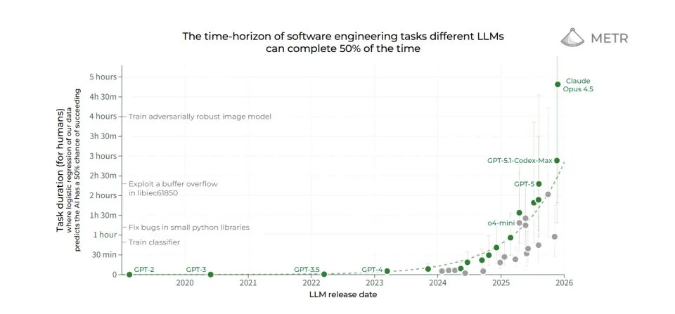 根据这一趋势预测,在未来不到十年内,我们将看到AI智能体能够独立完成当前需要人类花费数天或数周才能完成的软件编程任务。