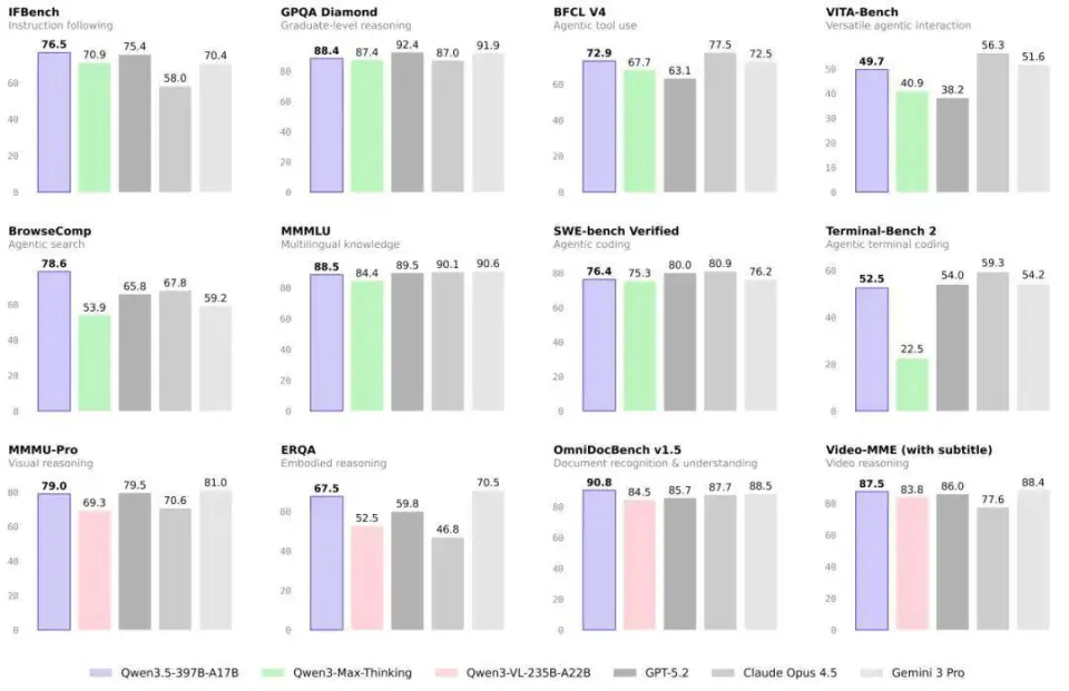 具体而言,Qwen3.5-Plus 以 397B 的总参数量,实现了对自家万亿参数模型 Qwen3-Max 的性能超越,且多项基准测试媲美 Gemini-3-pro 和 GPT-5.2 等闭源第一梯队模型。