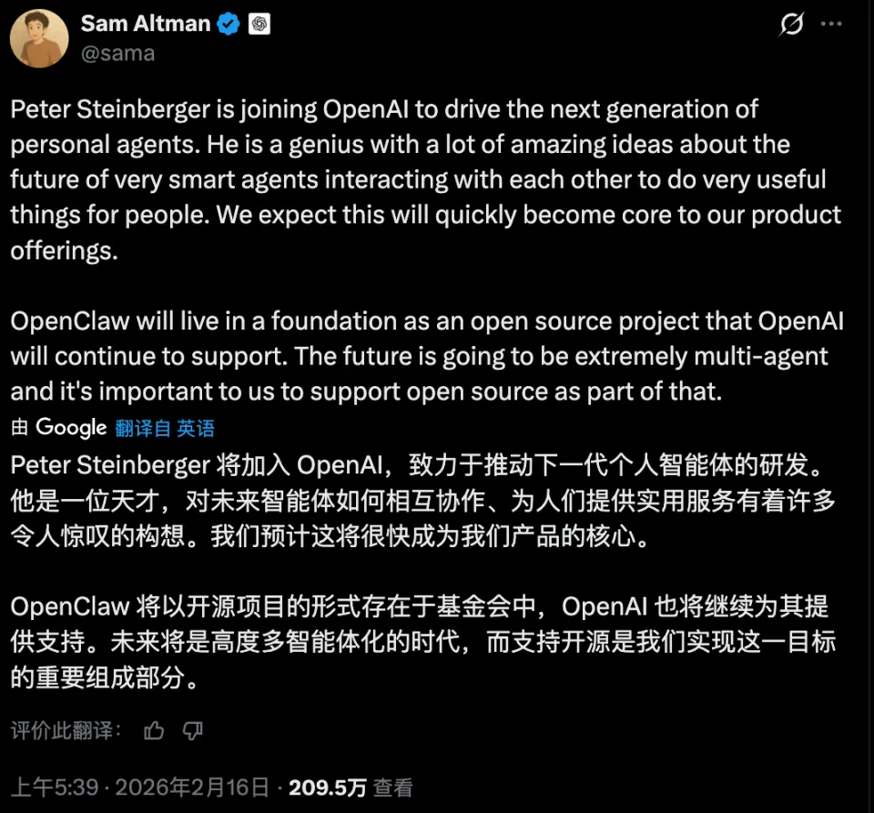 OpenAI 的 Sam Altman 也在 X 上宣布,Peter Steinberger 加入后,将致力于下一代个人助手智能体。