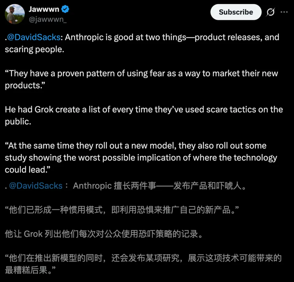 AI沙皇David Sacks猛烈抨击:Anthropic证明了自己擅长两件事:一是发布产品,二是吓唬人