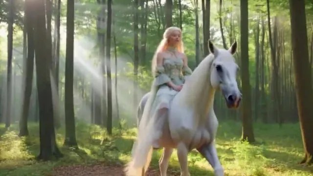 再加入背景音乐及人物对白的提示词,即可输出电影级片段——少女骑着骏马在林间小径缓步前行,温暖且空灵的音乐与森林的宁静氛围完美相融。