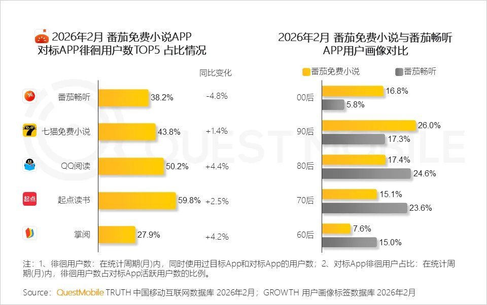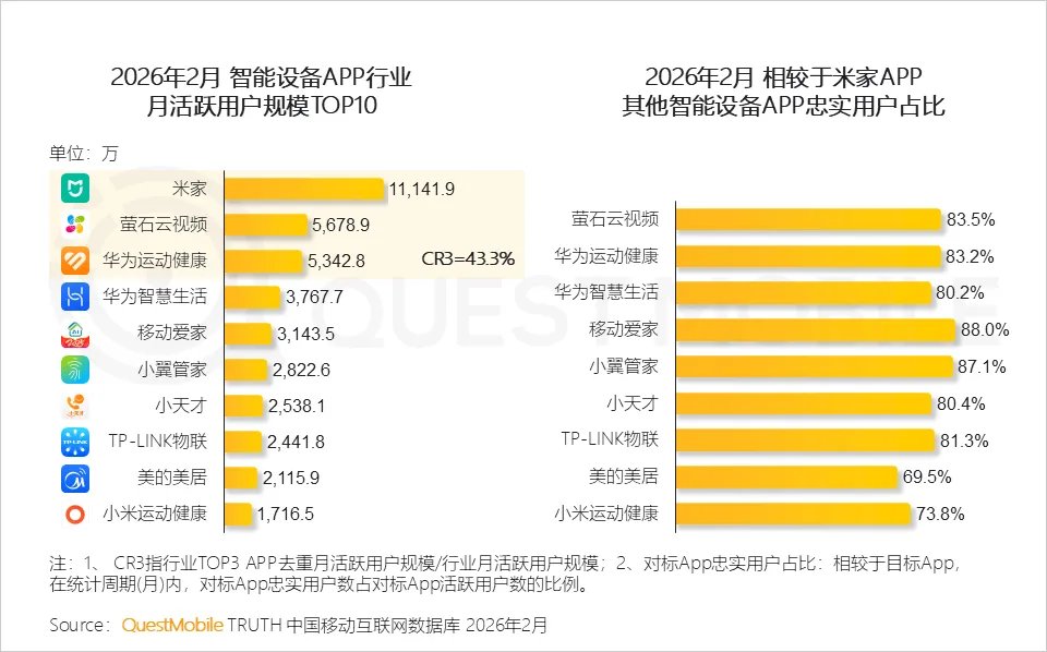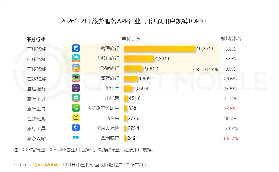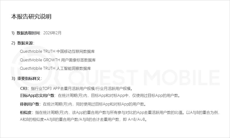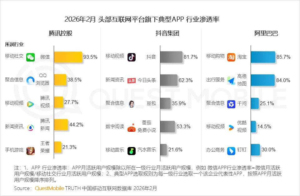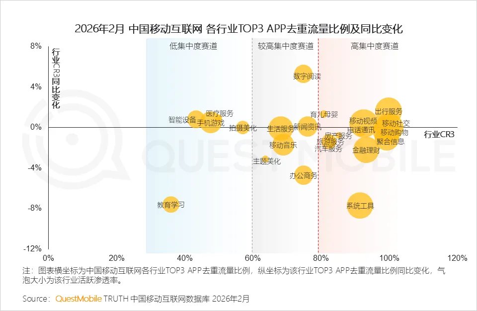 QuestMobile数据显示,2026年2月中国移动互联网一半行业TOP3 APP的去重流量占该行业总流量超八成比例。