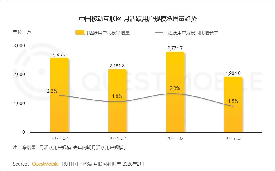 继续咱们的每周深度解读😎今天给大家分享一下2026年APP流量竞争新特征。QuestMobile数据显示,2026年2月,移动互联网月活用户规模净增量为1904.0万,这已是过去一年半里第三次跌破2000万(前两次分别为2025年12月、2024年7月),这意味着过去几年由宏观经济回暖、短视频应用爆发以及AI技术革新带动的快速增长,正在进入新阶段:一个由AI驱动、场景化落地的差异化增长时代正式到来。