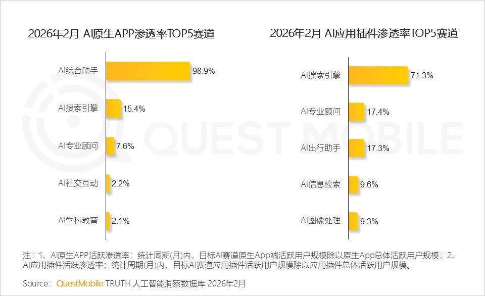 3、AI正成为流量格局的“新变量”:原生AI应用中综合助手渗透率超98%,插件式AI在搜索引擎、专业顾问等领域加速普及,驱动用户行为重构