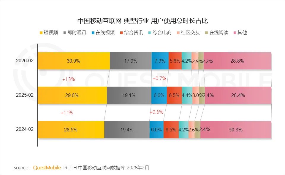 QuestMobile2026 APP流量竞争新特征:半数行业前三玩家切走八成流量,视频娱乐总时长逼近四成,AI成最大变量!