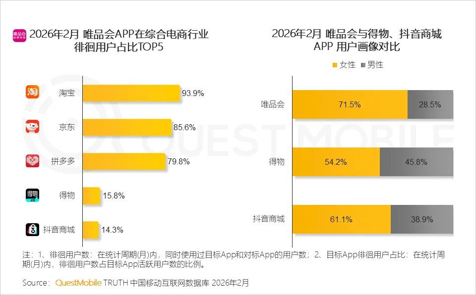 QuestMobile数据显示,截止2026年2月,唯品会与淘宝、京东、拼多多两两徘徊用户占比均在79%以上,表明其与头部TOP3APP形成了“共存”模式;与此同时,相较于得物、抖音商城,唯品会徘徊用户占比均在16%以内,突显其独特定位和差异化竞争优势。