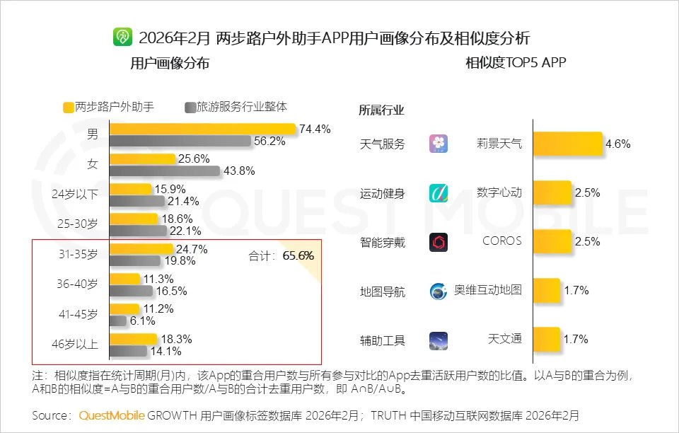 QuestMobile数据显示,使用两步路户外助手APP的用户,也在同步使用莉景天气、数字心动、COROS等APP,体现出该类人群在户外探险场景中与硬件设备、健康监测、环境感知等深度融合,构建了强功能依赖关系。